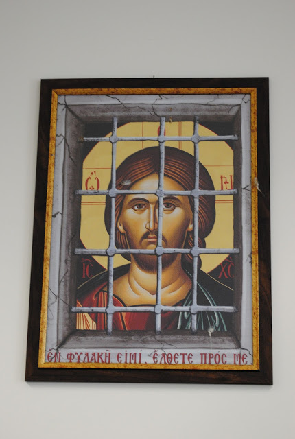 Με τη συνοδεία αρκετών σωφρονιστικών υπαλλήλων και αστυνομικών αρχίσαμε να εισερχόμαστε στην καρδιά του καταστήματος κράτησης. Ένα δέος διακατείχε τις ψυχές όλων όταν πατήσαμε τα πόδια μας στο σημείο των συμπλοκών που έγιναν πριν μερικά χρόνια και κόστισαν την ζωή στον Υπαρχιφύλακα Γιώργου Τσιρώνη, του οποίου η φωτογραφία στέκει στην είσοδο, δίπλα σε ένα καντηλάκι που σιγοκαίει…